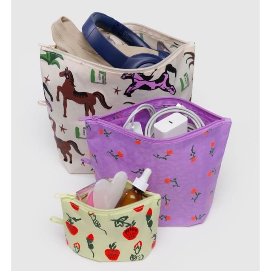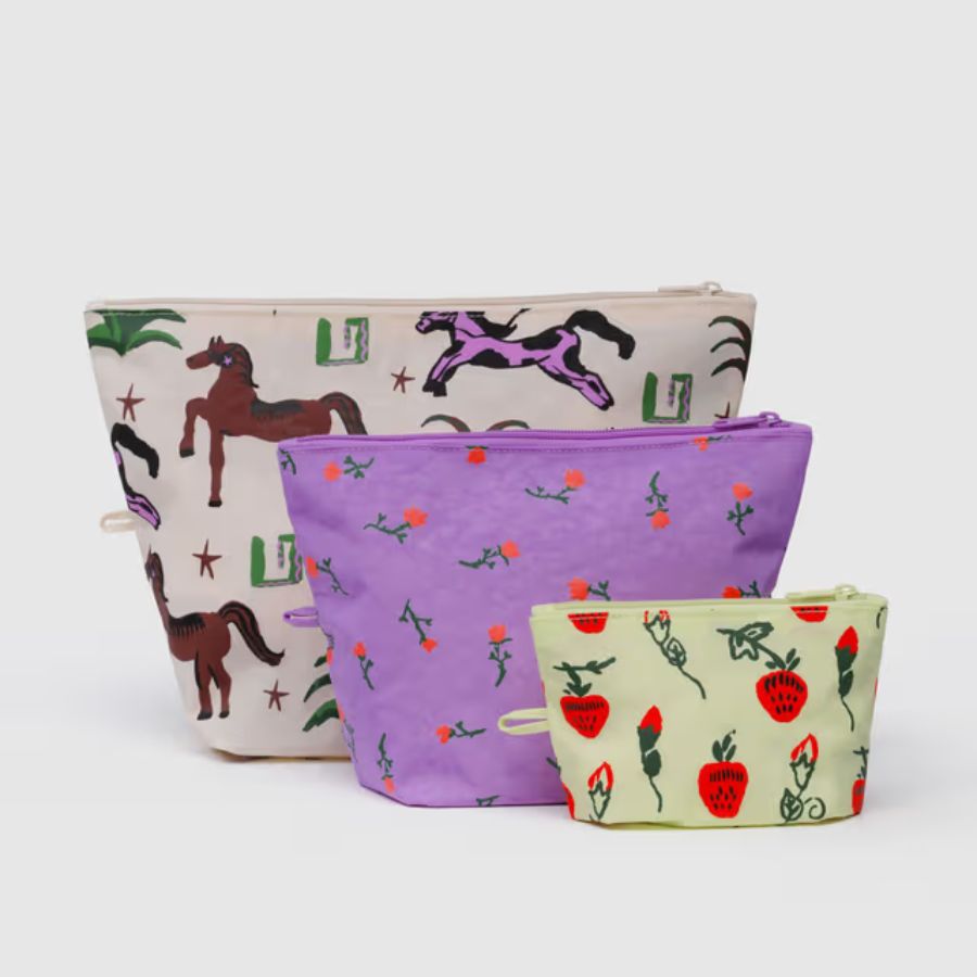 Our Go Pouch Set makes it easy to keep your bag neatly packed and organized. Whatever you're toting—coins, cords, or an extra pair of shoes—this set of three all purpose pouches keeps it together. They expand to hold your essentials and lay flat when not in use.