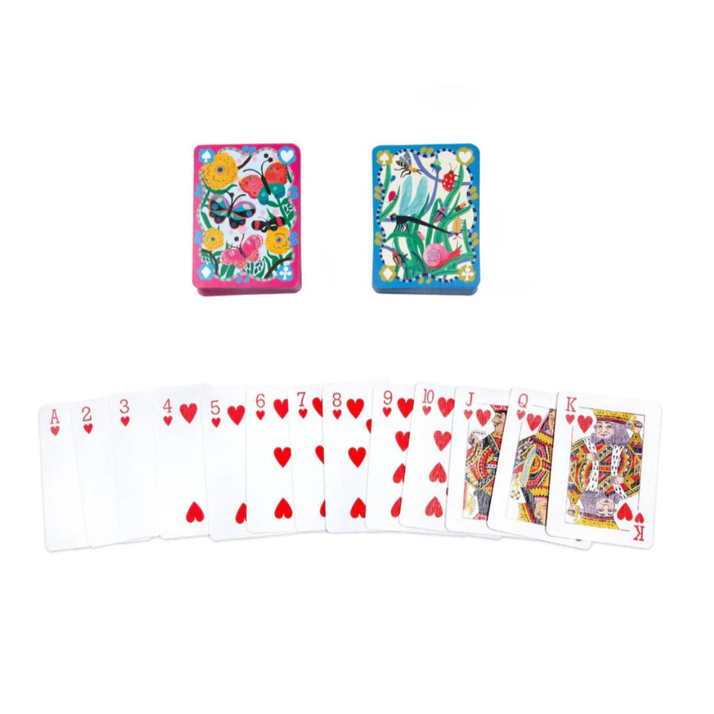An assortment of two playing card sets, one featuring butterflies floating among flowers and the other a dragonfly and bee among a variety of vibrant beetles, both illustrated by Monika Forsberg. Each set includes standard-sized cards printed on high-quality blue core paper—perfect for players young and old. A wonderful introduction to card games of all kinds and a gift the whole family can enjoy.