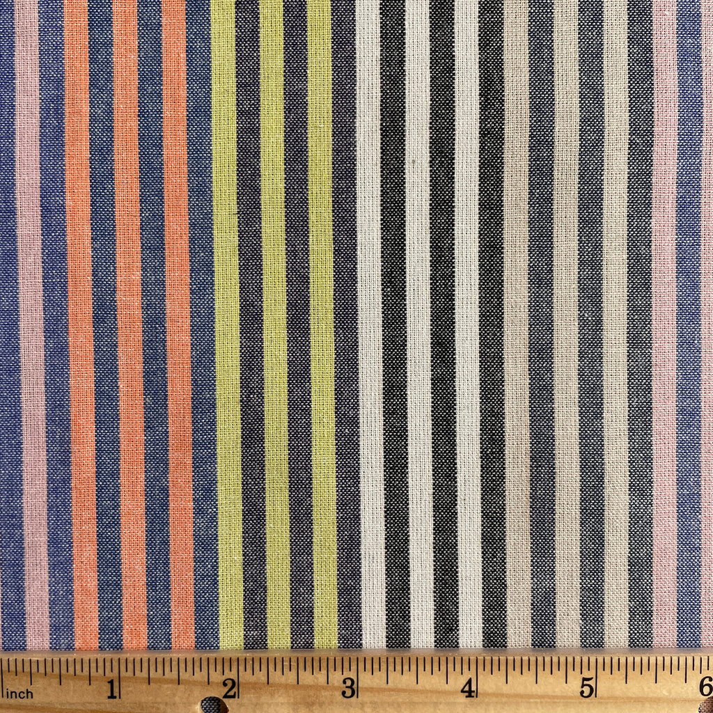 Description: This colorful cotton stripe is a yarn-dyed homespun fabric sure to make any dress, quilted jacket, or quilt look amazing! What's so special? Each yarn is pre-dyed before being woven, so the design is integrated right into the fabric!