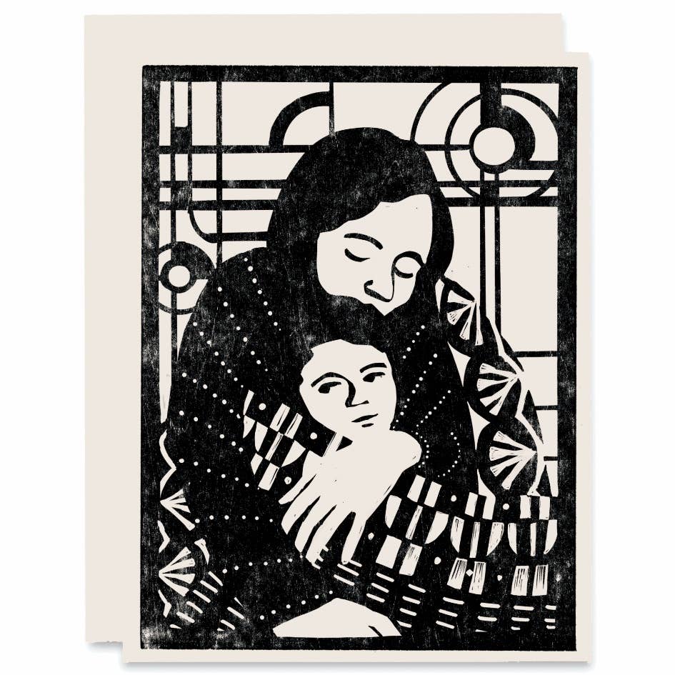 Digital woodcut, offset printed with ink made from renewable biopigments, 100% post-consumer recycled paper, A2, blank inside, cello sleeve with envelope.