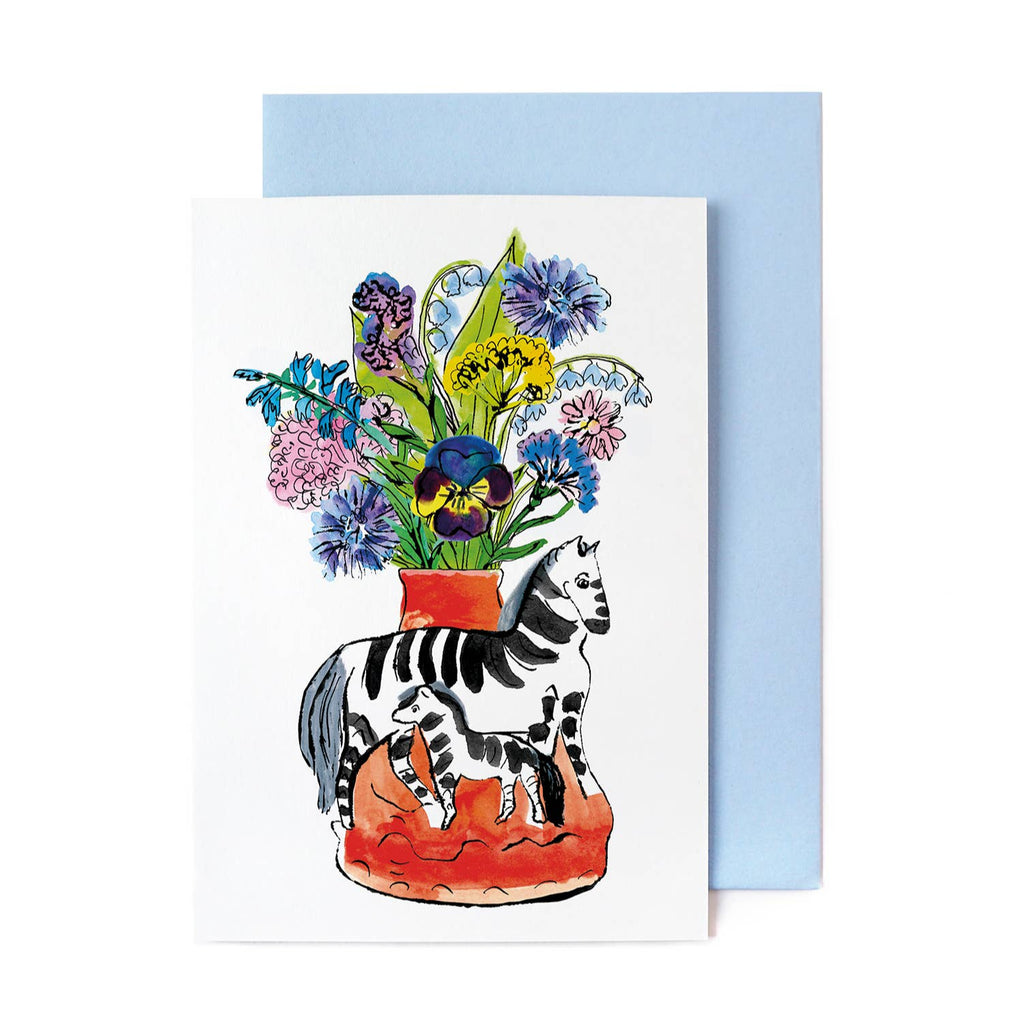 A charming card featuring a zebra mother + child and flower bouquet. Inspired by the well-known and beloved antique Staffordshire vases popular in England in the 1700s-1900s. A contemporary twist on a well-loved classic! Printed with a special technique (yet still eco-friendly) to make the colours extra vibrant, this is a beautiful card which can be framed as a mini artwork. Printed in the UK with sustainable, forestry certified premium quality paper. Comes with a complimentary Wedgwood blue envelope.