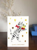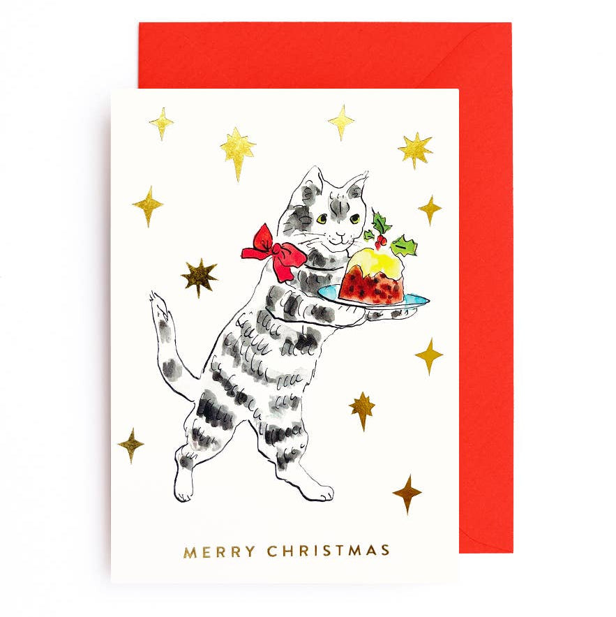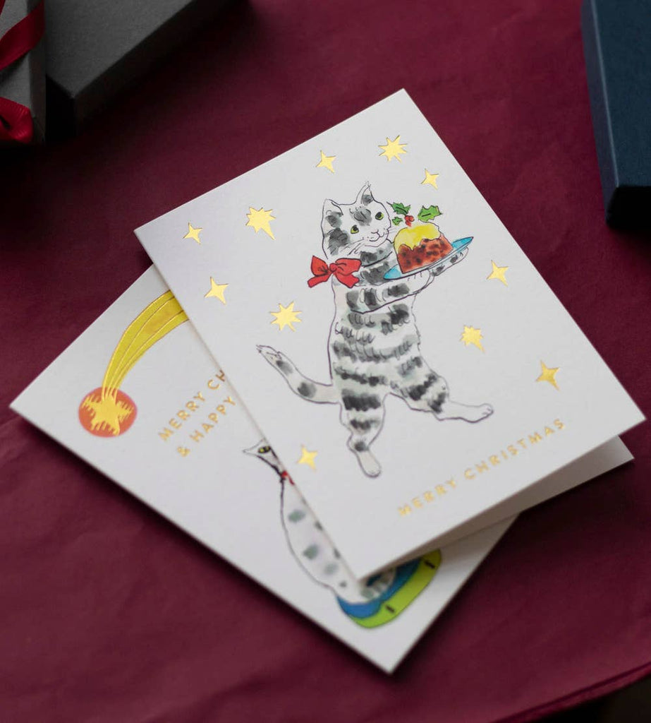 Features a charming illustration of a cat carrying a delicious Christmas pudding, surrounded by festive gold foil stars! Comes with a festive red envelope. A6 + blank inside. Printed on sustainable, responsibly sourced FSC premium quality paper milled in the UK and printed by eco-friendly printers using environmentally friendly ink. Fully recyclable.