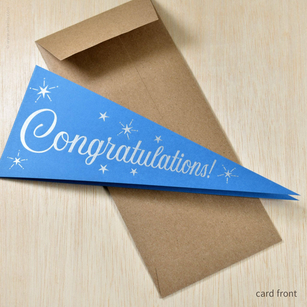 Goal reached! Celebrate achievement with this triangular-cut card printed in shiny silver foil on blue paper. Blank inside for your message. Long, open-end brown bag envelope.