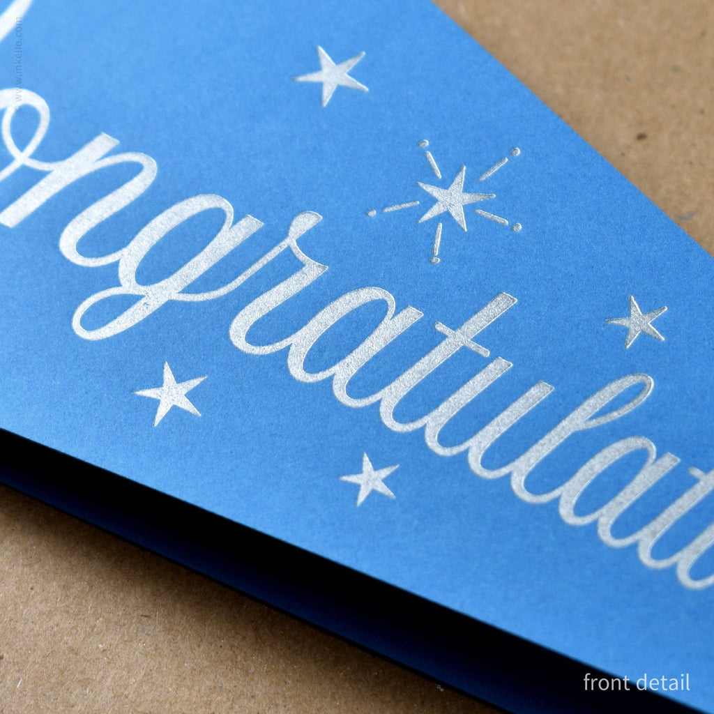 • Front of card: "Congratulations" and stars in metallic silver foil