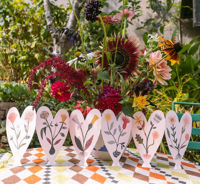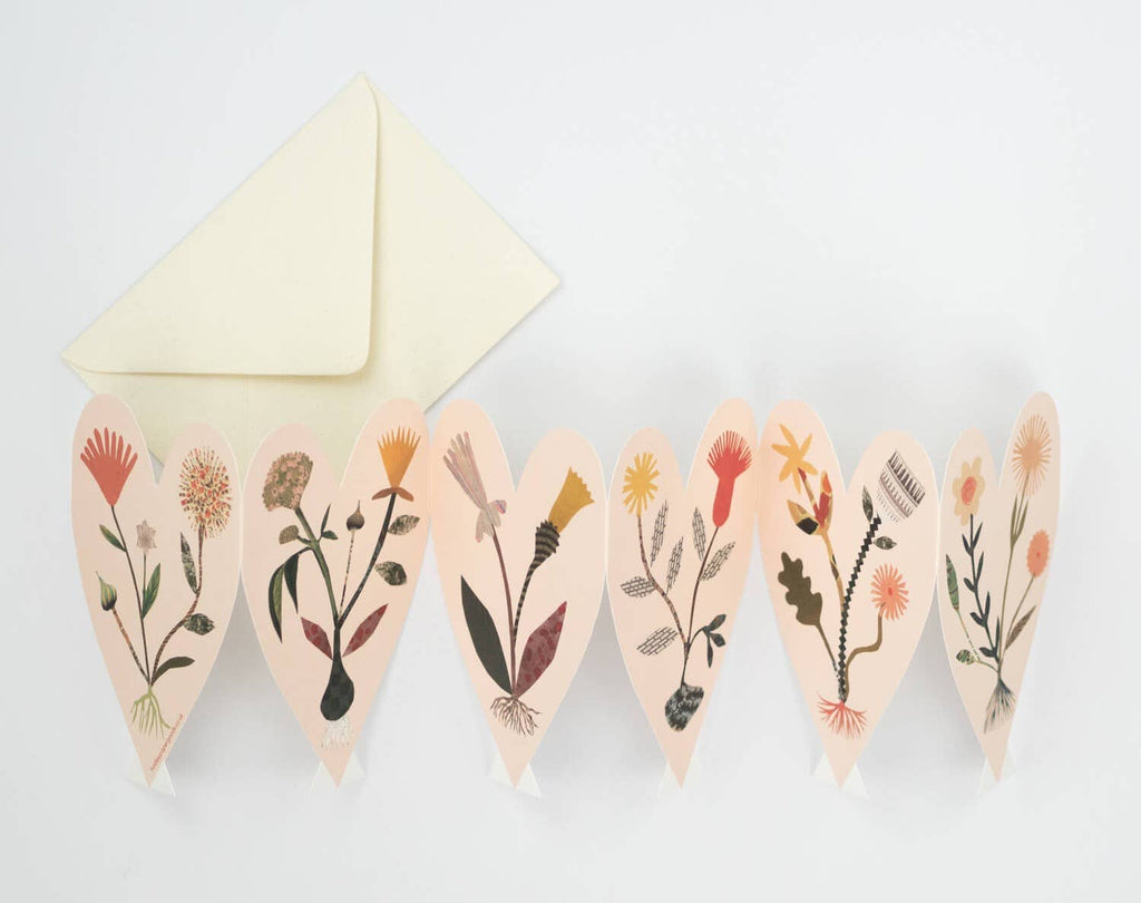 A concertina of beautiful hearts! Featuring hand-collaged whimsical wild flowers in a beautiful natural colour scheme. This fold-out card is perfect for displaying in a window, on a mantelpiece, shelf, or on the wall. It is self-standing when extended and also looks lovely displayed flat on a wall. The concertina card is completely collapsible and comes in a standard C6 envelope size perfect for posting.