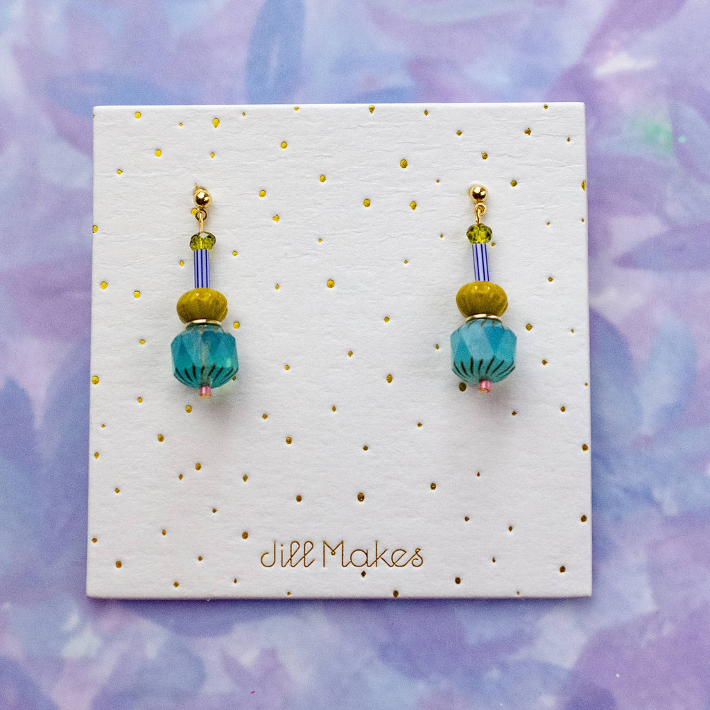 These handmade earrings are made with colorful Czech glass beads, arranged to create a vibrant design. The bright colors make them a versatile accessory for both everyday wear and special occasion Details: Earrings measure 1.5 inches in length. Gold plated over sterling silver earring post *Beads may vary slightly.