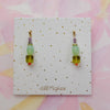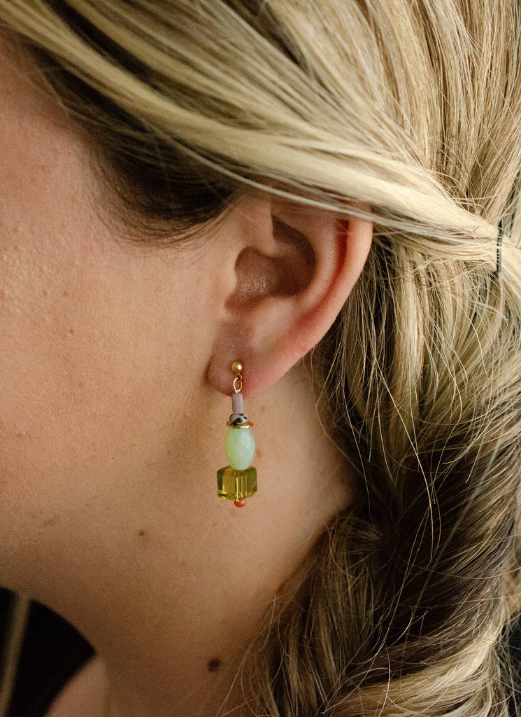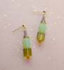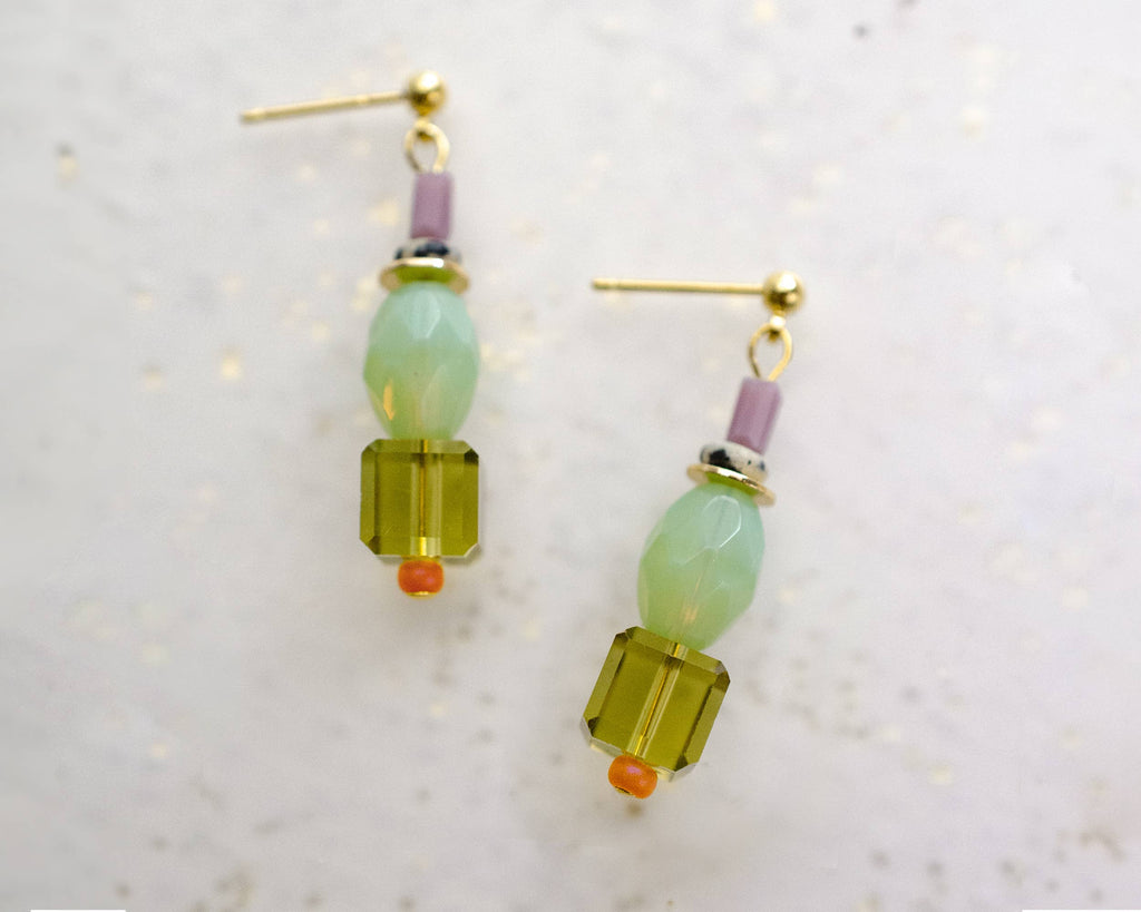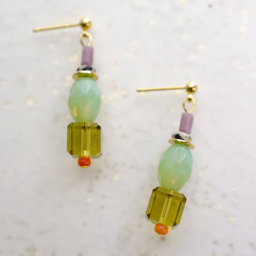 These handmade earrings feature an eclectic mix of colorful Czech glass beads and natural stone beads, including olive green, seafoam green, purple, and Dalmatian jasper. The lively combination of colors brings a fun and vibrant touch to any outfit. Details: Earrings measure 1.5 inches in length. Gold plated over sterling silver earring post *Beads may vary slightly