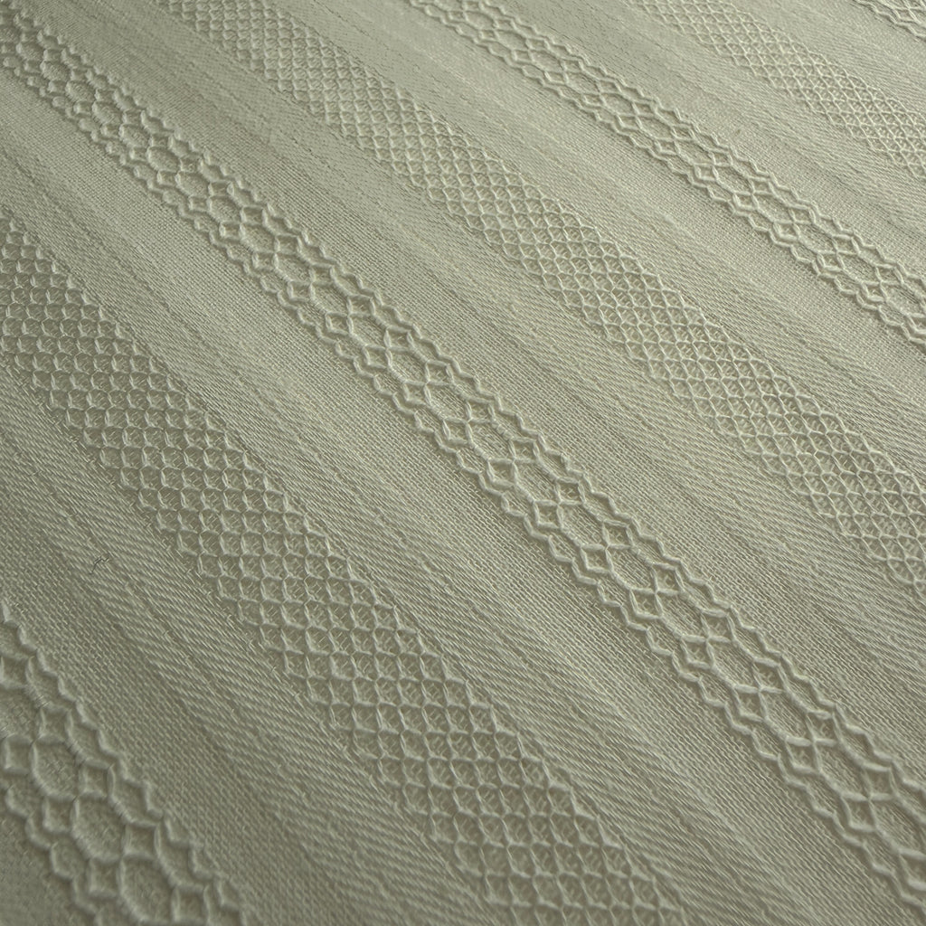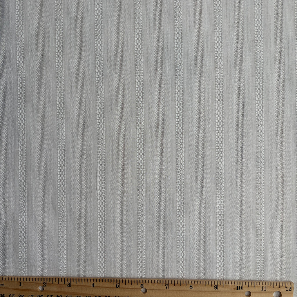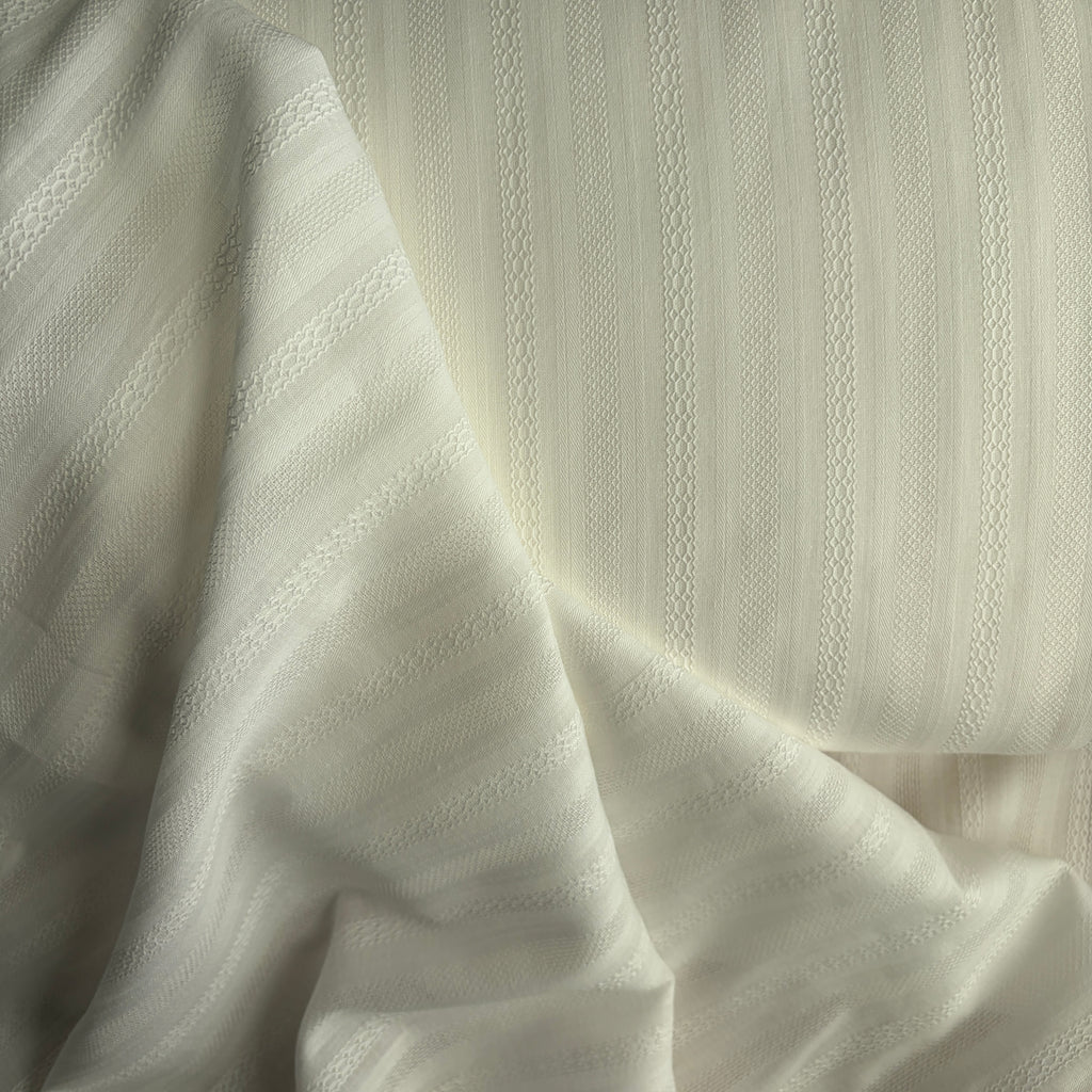 Our Atelier Stripe is a light cotton dobby. This fabric features a classic stripe repeat achieved through an intricate dobby weave, which alternates between a flat, fine cotton and a slightly raised, honeycomb-like texture. This controlled variation gives the fabric a quiet dimension and a sophisticated hand feel.