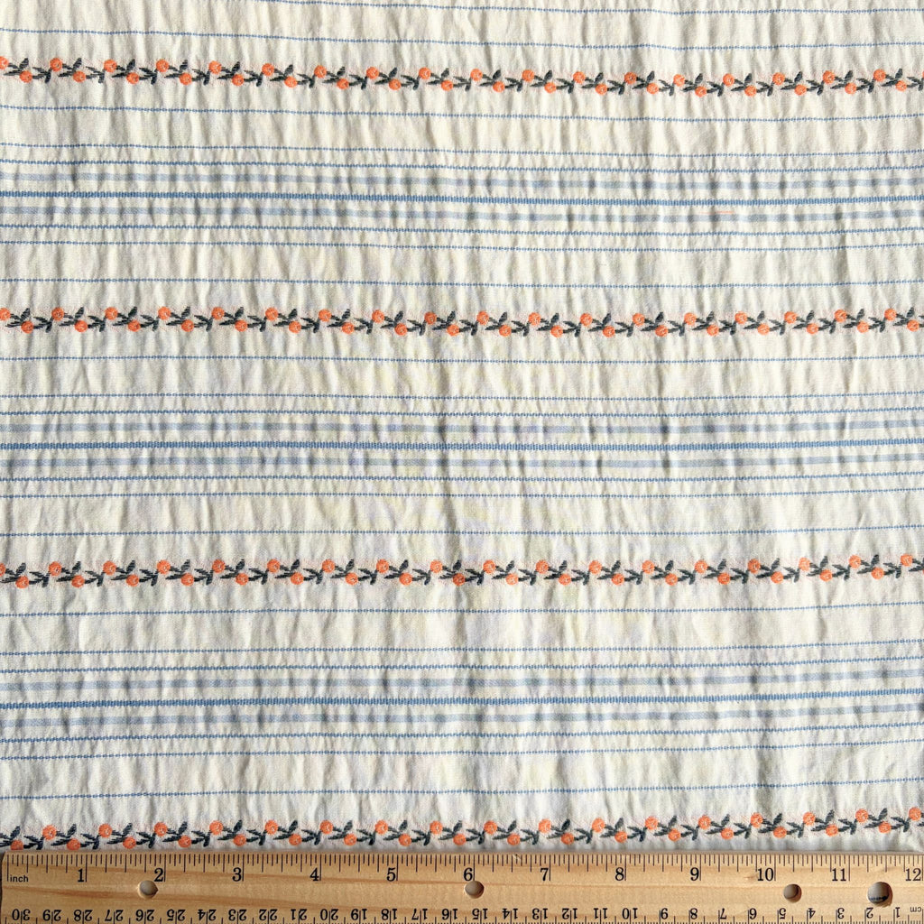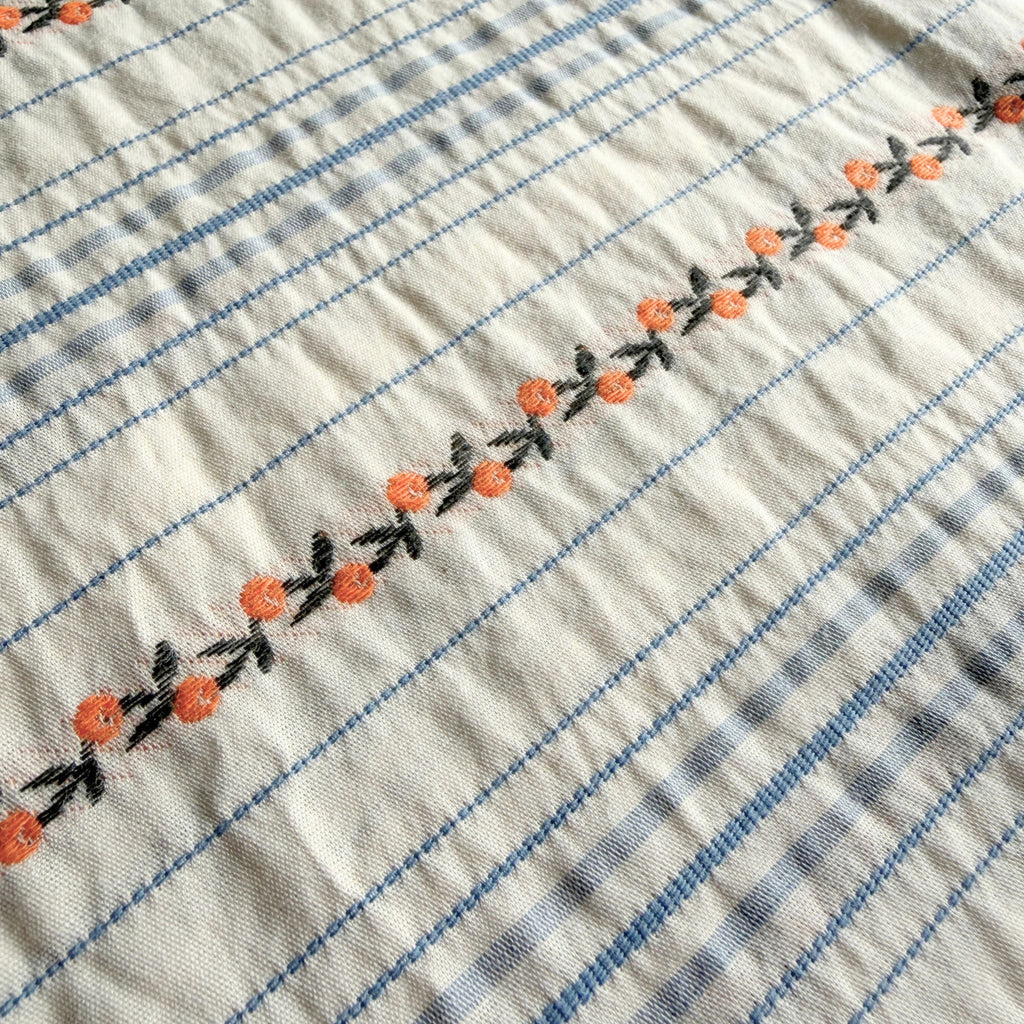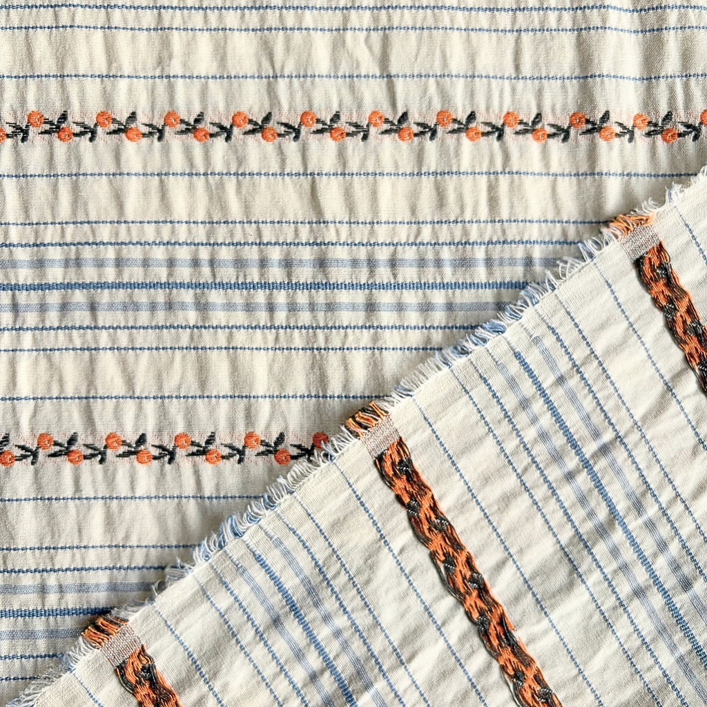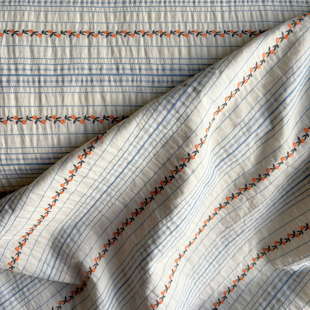 Woven from soft cotton, the fabric features a serene pattern of classic light blue pinstripes. Between these stripes, a sweet secret unfolds: a continuous chain of tiny, embroidered peachy-pink rosettes, tracing a path like a forgotten heirloom ribbon.