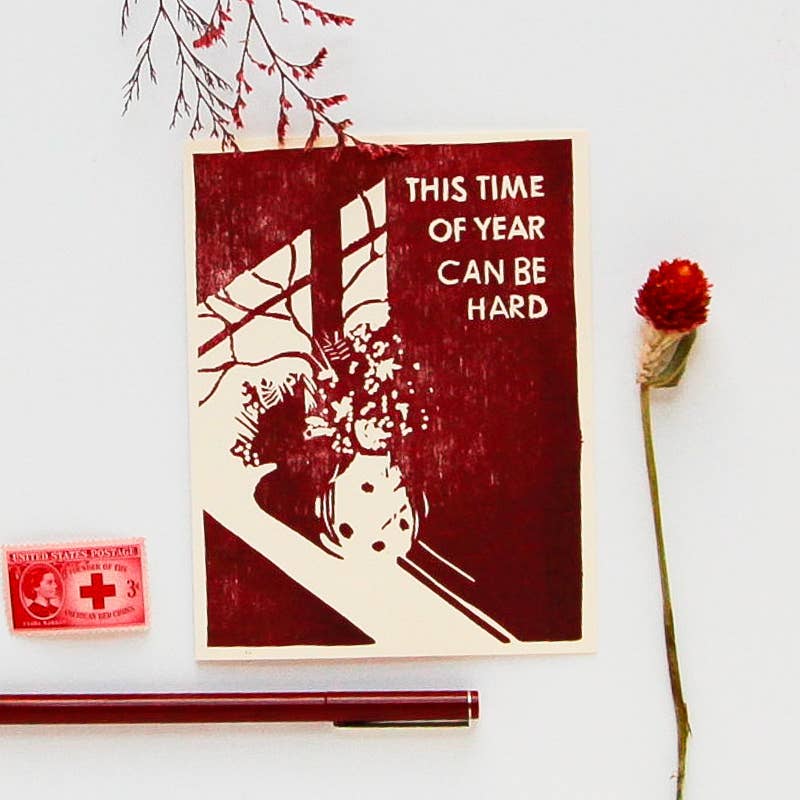 Letterpress, 100% post-consumer recycled paper, A2. Blank inside, cello sleeve with envelope.