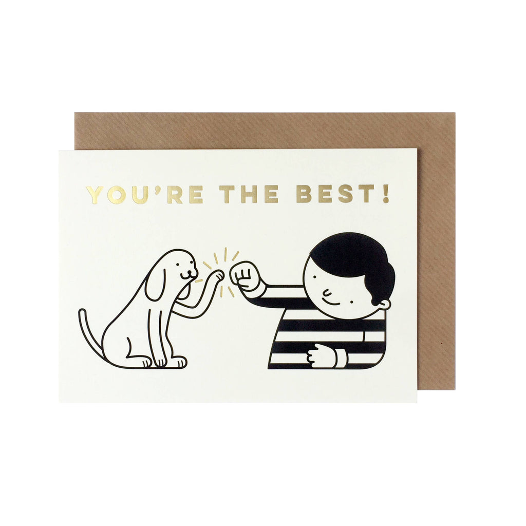 A super fun friendship, birthday, thank you or any reason card featuring a boy and his best dog friend. Litho printed with gold foil detail highlights. 5 x 7 inches + blank inside Also available in a red and blue colourway in separate listing. Printed in the UK on heavyweight FSC responsibly sourced 300gsm premium quality sustainable paper. Comes with a 100% recycled Kraft envelope.