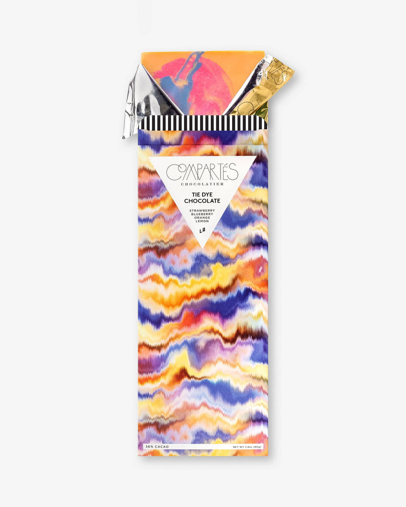Compartés Rainbow Tie Dye Chocolate Bar is brand new and limited edition. For Pride month in June, this tie dyed chocolate bar is made from 4 different chocolates swirled together (strawberry, blueberry, orange and lemon) for a delightful Summer treat with psychedelic flavors and colors that is the most unique and delicious chocolate bar you'll ever try! This amazing new chocolate bar features California farmers market fruit flavors swirled by hand by Jonathan himself into a unique edible work of art.