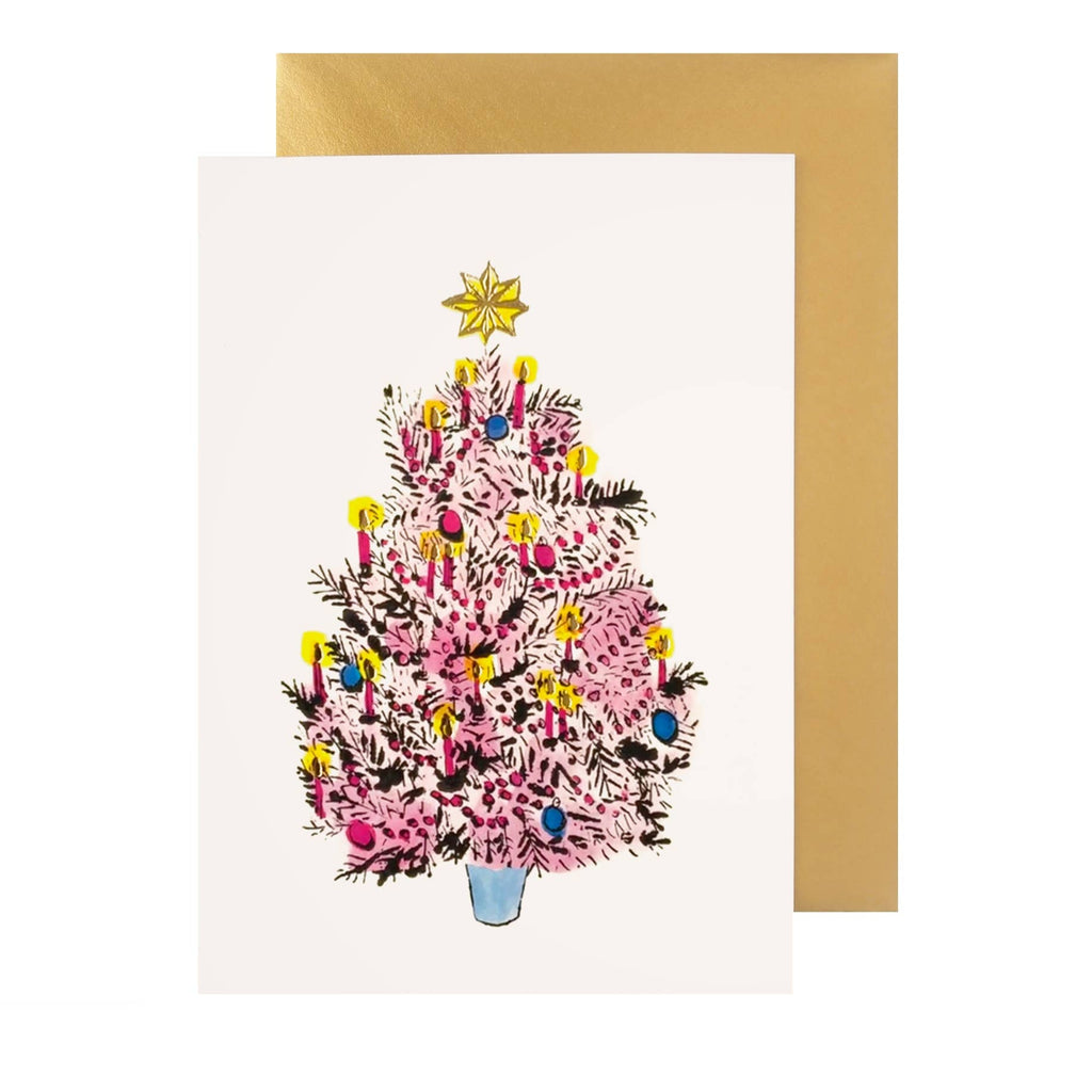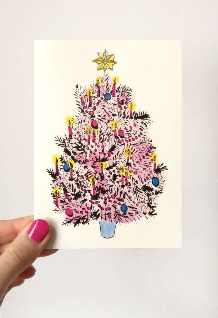 Kitsch Pink Christmas Tree greeting card with gold foil highlights on the candle flickers and star. Comes with a fabulously kitsch pink envelope. Available with metallic gold envelopes in a separate listing. One of our all time best-selling Christmas cards! Printed on sustainable, responsibly sourced premium quality paper milled in the UK and printed by eco-friendly printers using environmentally friendly ink. Fully recyclable. Comes packaged in a recyclable cello. A6 size + blank inside for your own festive message.