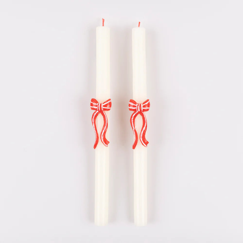 Bows are the ultimate celebratory statement! So, we've embellished these ivory table candles with these chic touches for a striking effect. Red and pale pink stripes add a sophisticated look, while the red wicks make them irresistibly eye-catching. Perfect for your dinner table, styling your mantel, or gifting to your favorite host.