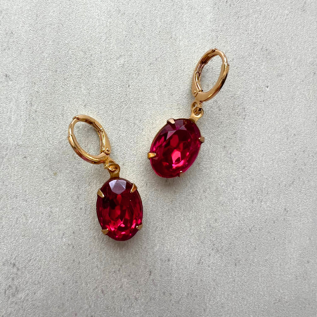 Add a splash of color with the Vintage Jenny Earrings. Jenny is our fuscia loving gal at the Harmony shop and these crystal are her in color form. Featuring vibrant fuscia vintage Czech glass set in elegant 18k gold plated huggie hoops. Perfect for adding a touch of glam, they’re ideal for day-to-night style that pops with personality.