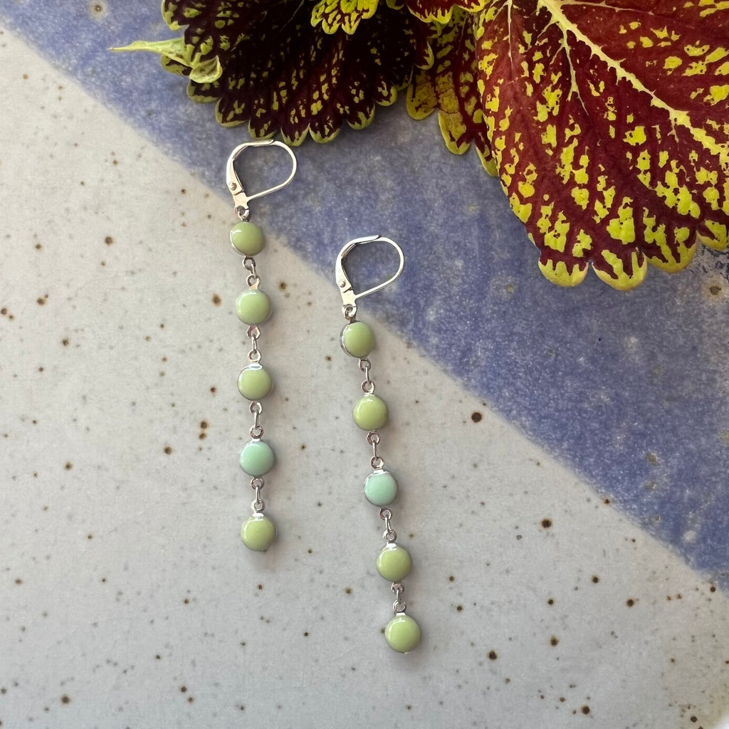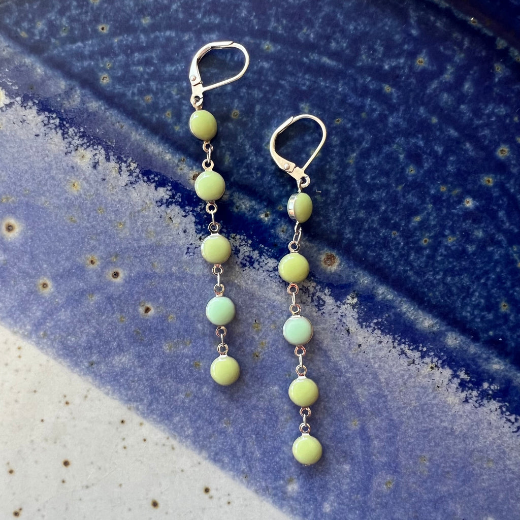 Bring a subtle and playful style with the Vintage Sage earrings. These playful dangle earrings combine creamy sage colored vintage enamel dots set in silver swinging from sterling silver-plated hoops, creating a fun and eye-catching look. Just like our team member Sage they add a cheerful twist to your everyday or special occasion outfits.