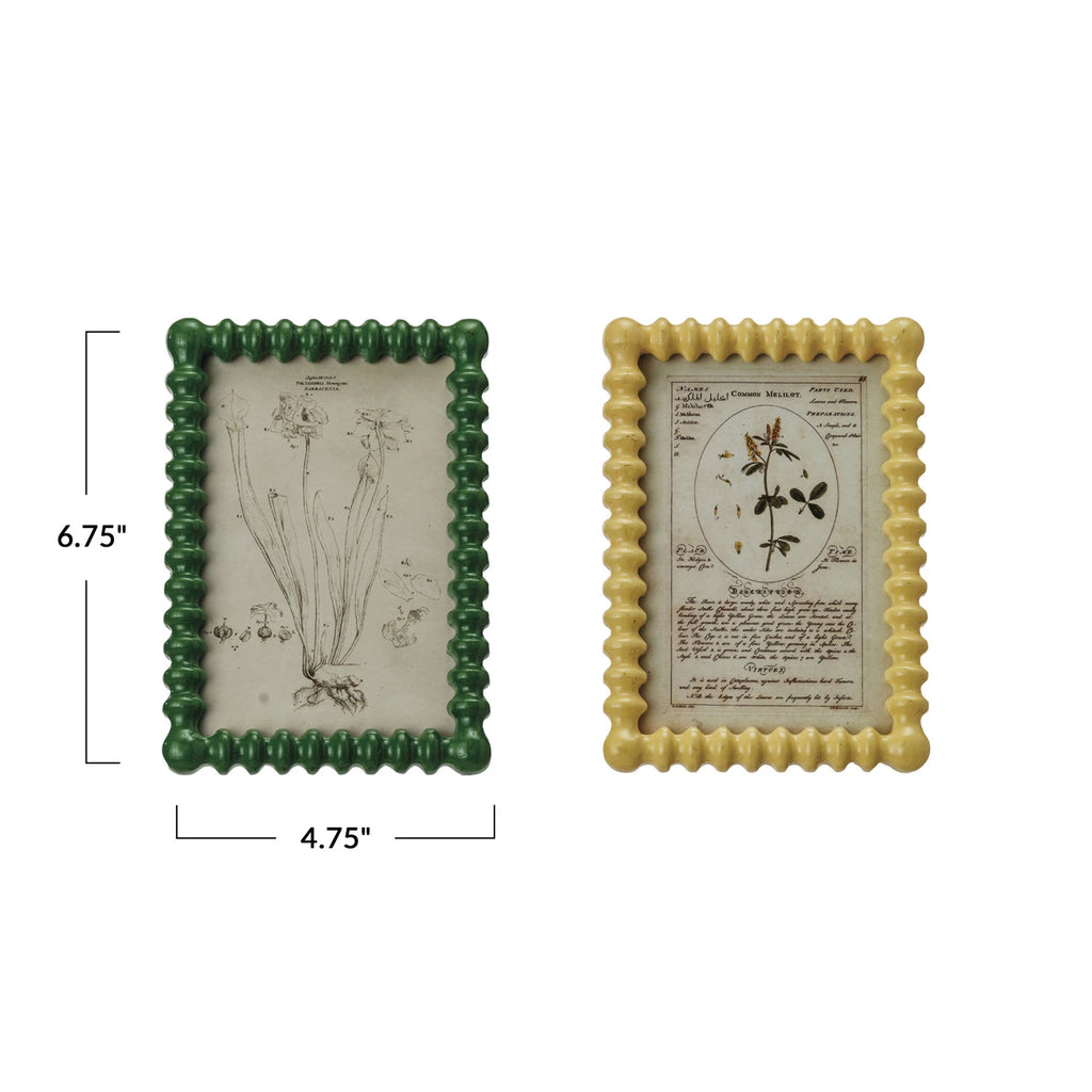 A spindle picture frame sized for 4" x 6" photos. Yellow finish. Designed to hold and display your images without unnecessary embellishment.
