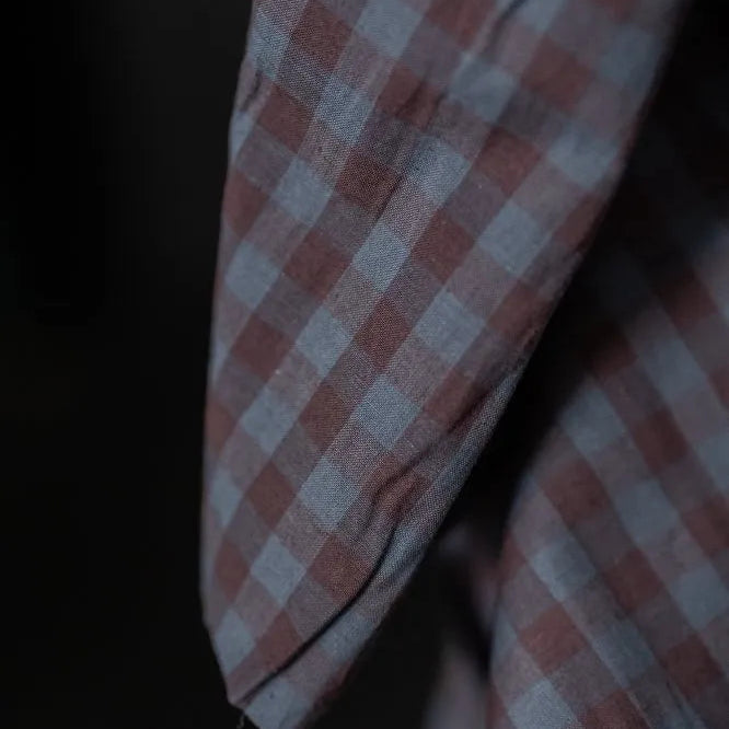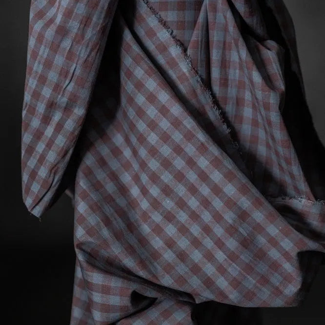 An aubergine purple and chalky blue gingham. Checks are approximately .47 inches wide.