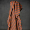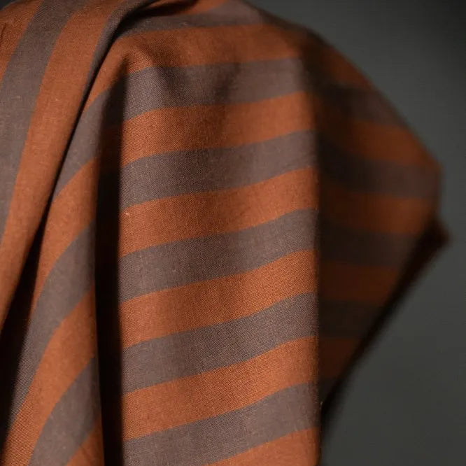A cosy wide stripe in tones of chestnut and cool dark brown. Stripes are approximately .79 inches wide and run parallel to the selvedge.