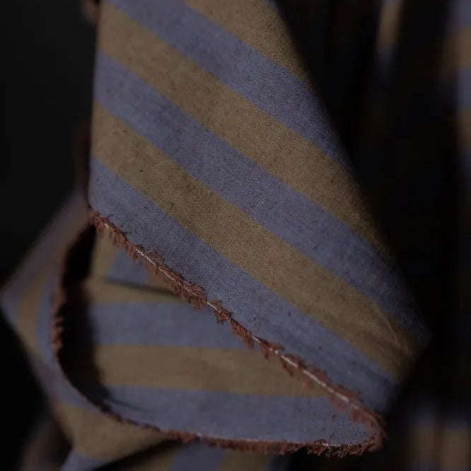 A lavender blue and cool brown stripe. Stripes are approximately .79 inches wide and run parallel to the selvedge.