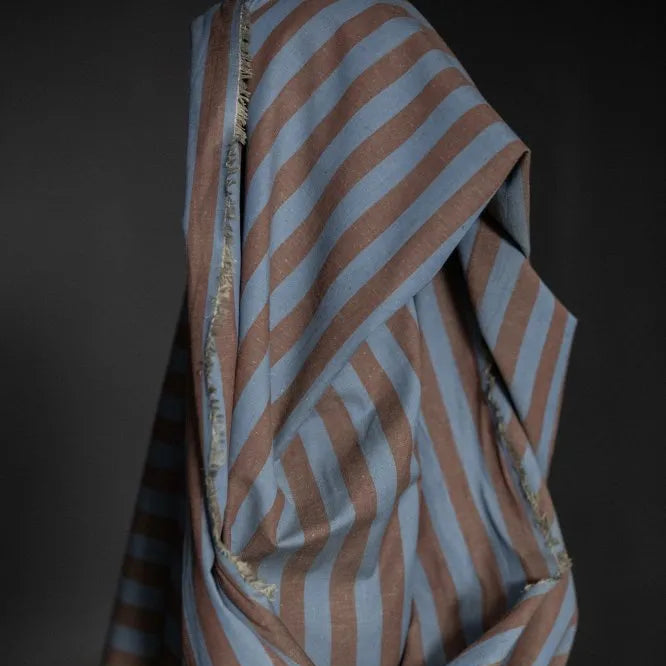 A cornflower blue and dark aubergine stripe. Stripes are approximately .79 inches wide and run parallel to the selvedge.