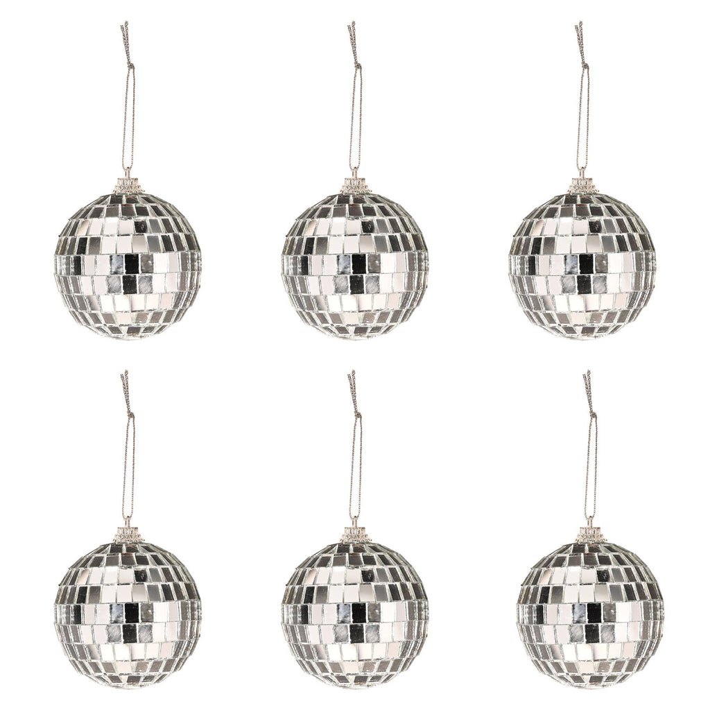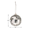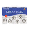 Pack of six Disco Balls measuring 2.25". Each disco ball includes an attached string for hanging.