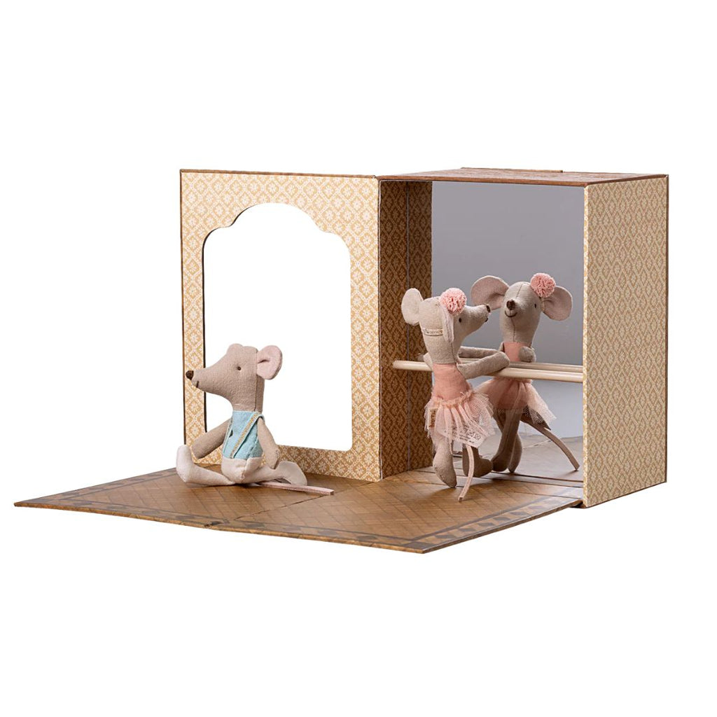 Open the doors of this magical playset and explore a world of dance, stardust and storytelling. This enchanting set transforms from a cosy mouse house to a ballet studio where dreams take centre stage. The mirrored wall glimmers while the magnetic barre holds fast to every tiny paw as the mice rehearse their grand performance. Two ballet mice, already dressed for the spotlight, wait eagerly in their beds, ready to twirl and tell their stories on stage.