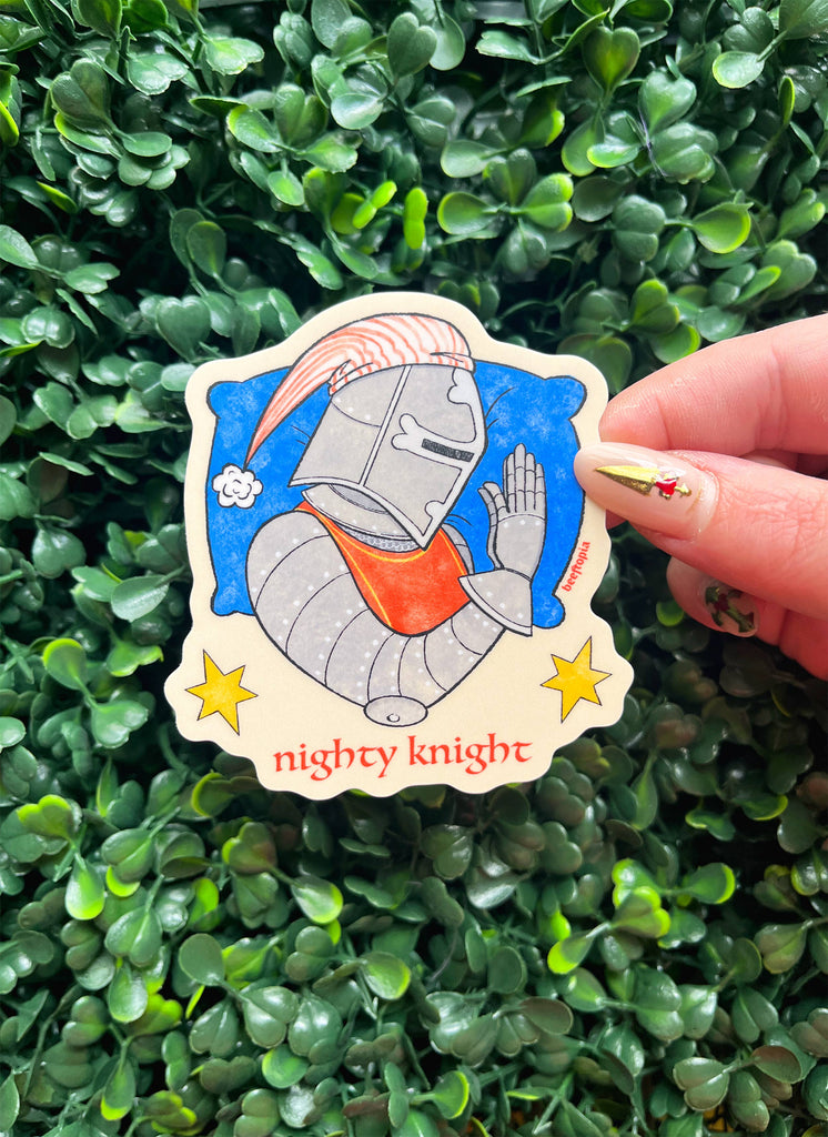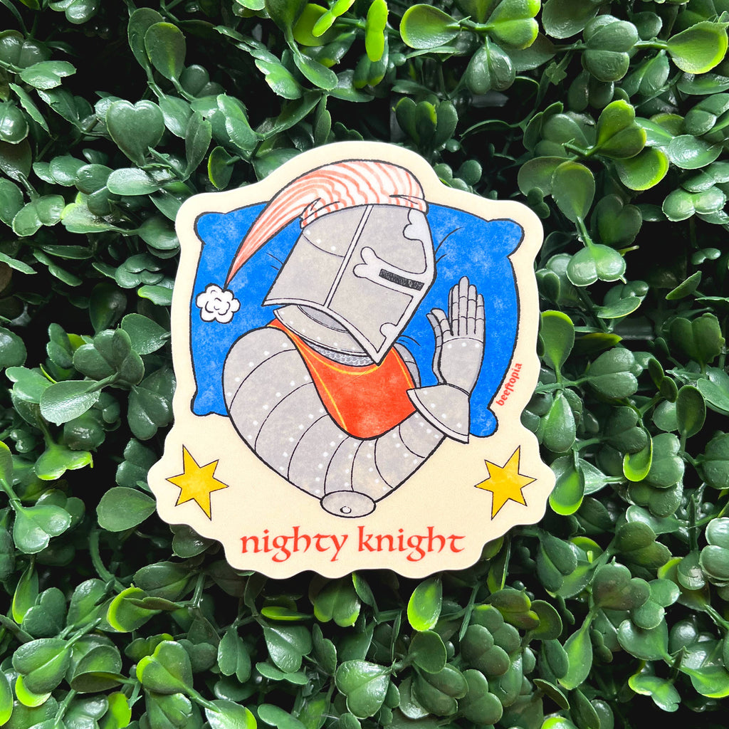 Castlecore loving sleepyheads and certified pun enjoyers finally have a mashup just for them! This sticker depicts a knight drawn in a medieval style fast asleep on a pillow alongside the words "nighty knight". The ideal gift for anyone who just needs a nap after a long day at the renaissance faire. Sticker measures 3.1in x 2.9in. It has a velvety matte finish.