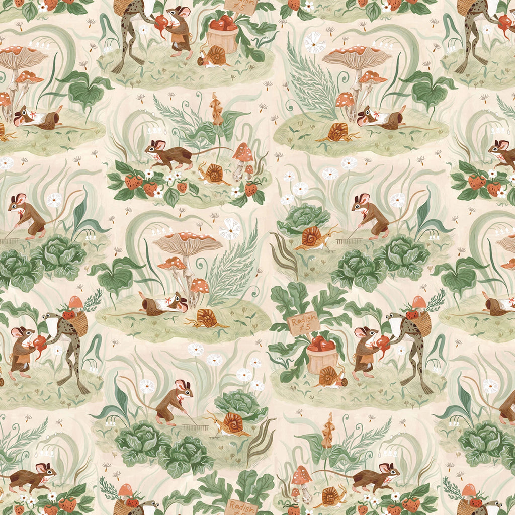 Description: This charming fabric features a whimsical design of mice engaging in various garden activities, set against a soft, cream-colored background. The pattern includes detailed illustrations of mice carrying baskets, picking berries, and interacting with oversized mushrooms and lush greenery, creating a delightful countryside scene perfect for any project that needs a touch of playful elegance.