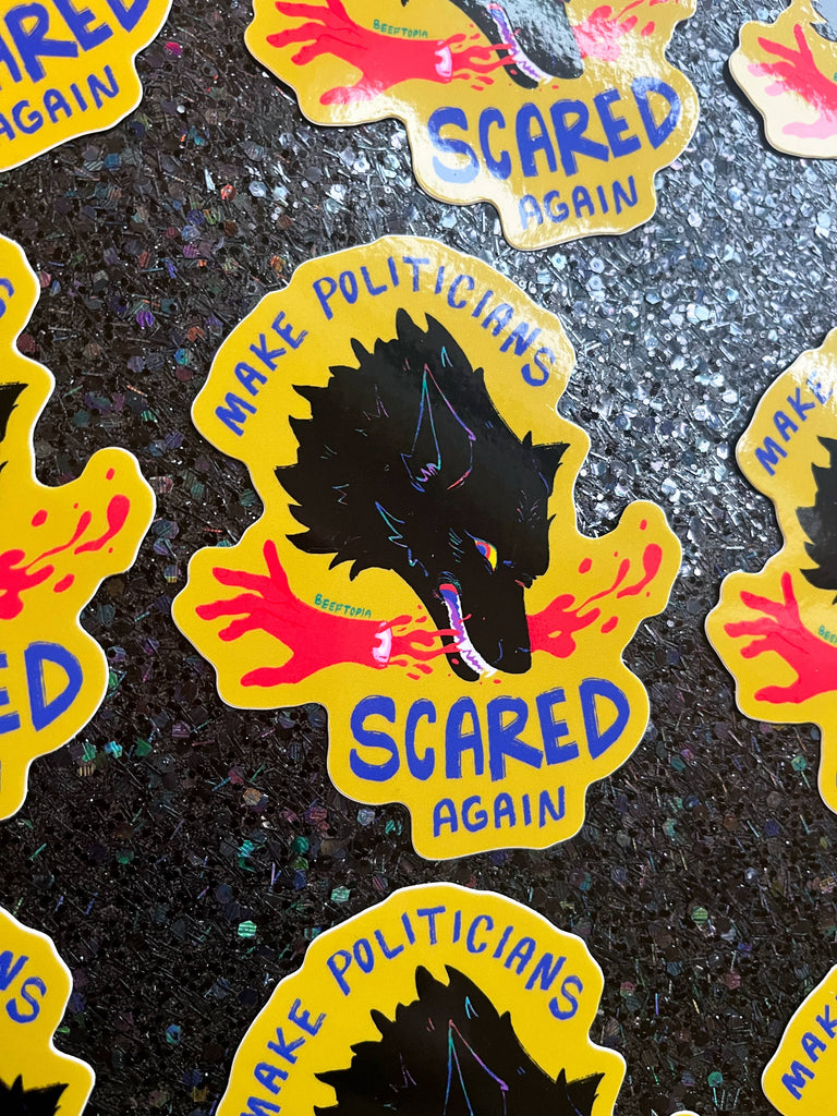 This sticker features a wolf head, biting off the hand that feeds it, alongside the words: "MAKE POLITICIANS SCARED AGAIN".