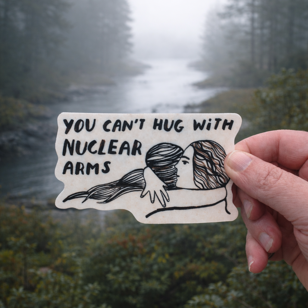 A small reminder of what actually matters. This die-cut vinyl sticker features an original illustration of two friends wrapped in an embrace beneath the words: “You Can’t Hug with Nuclear Arms.” It’s tender, direct, and quietly powerful—pairing softness with a clear message about connection over destruction. Printed from my original artwork, this sticker is durable, weather-resistant, and made to last. Perfect for water bottles, laptops, sketchbooks, notebooks, or anywhere you want a little human warmth in your daily life. Details: Durable vinyl Weather-resistant Die-cut shape Original artwork by Anisa Makhoul Thoughtful, meaningful, and easy to display—this is a small piece with a big heart.