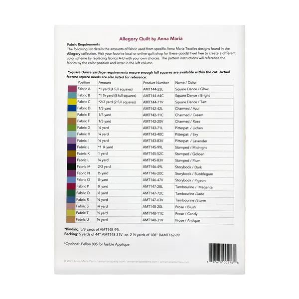 This quilt pattern draws from the Allegory collection, pairing diminutive prints with straightforward appliquéd florals. The Square Dance panels align precisely with 11" on-point squares, delivering meticulous fussy-cut elements. Instruction focuses on raw edge appliqué methods using fusible web and machine stitching to complete the work.