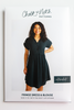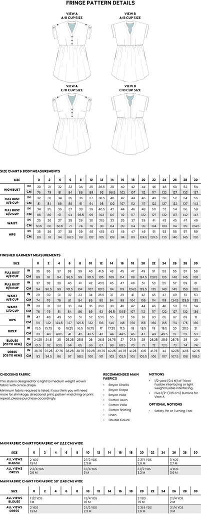 The Fringe pattern is a woven dress and blouse with two views. View A has a button-up front, elbow sleeve, and sleeve tab. View B has a pullover and a notched front with a cuff. Both views include two cup sizes and optional waist ties, and the sleeve/cuffs are interchangeable.