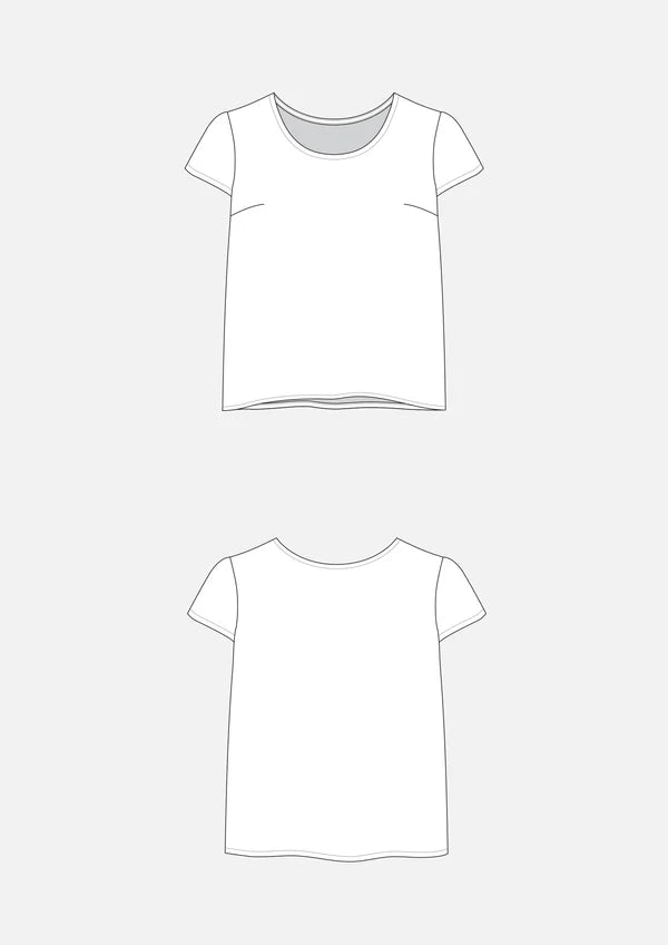 A woven t-shirt with capped sleeves and scoop neck. Fitted at the shoulders, this top falls into a loose shape below the bust. Techniques involved include straight seams, bias binding, setting sleeves, and basic hemming.