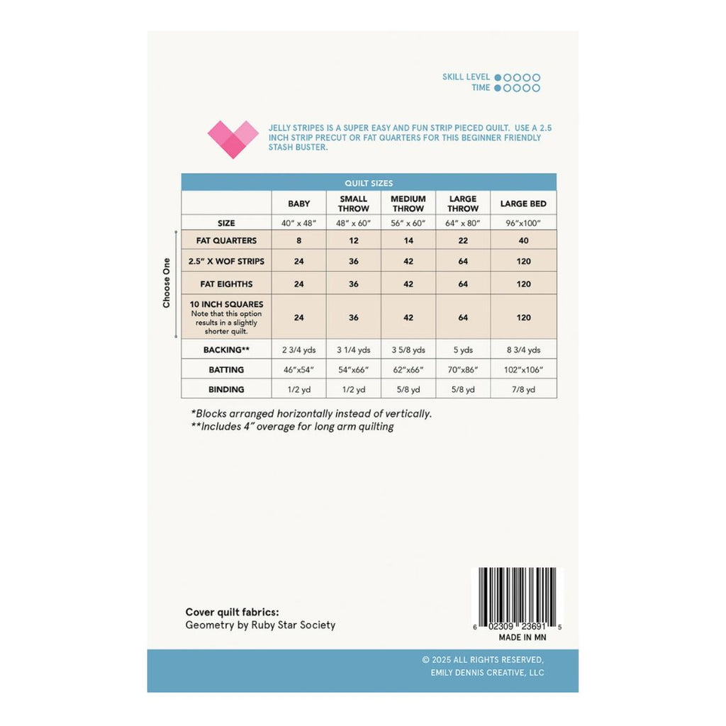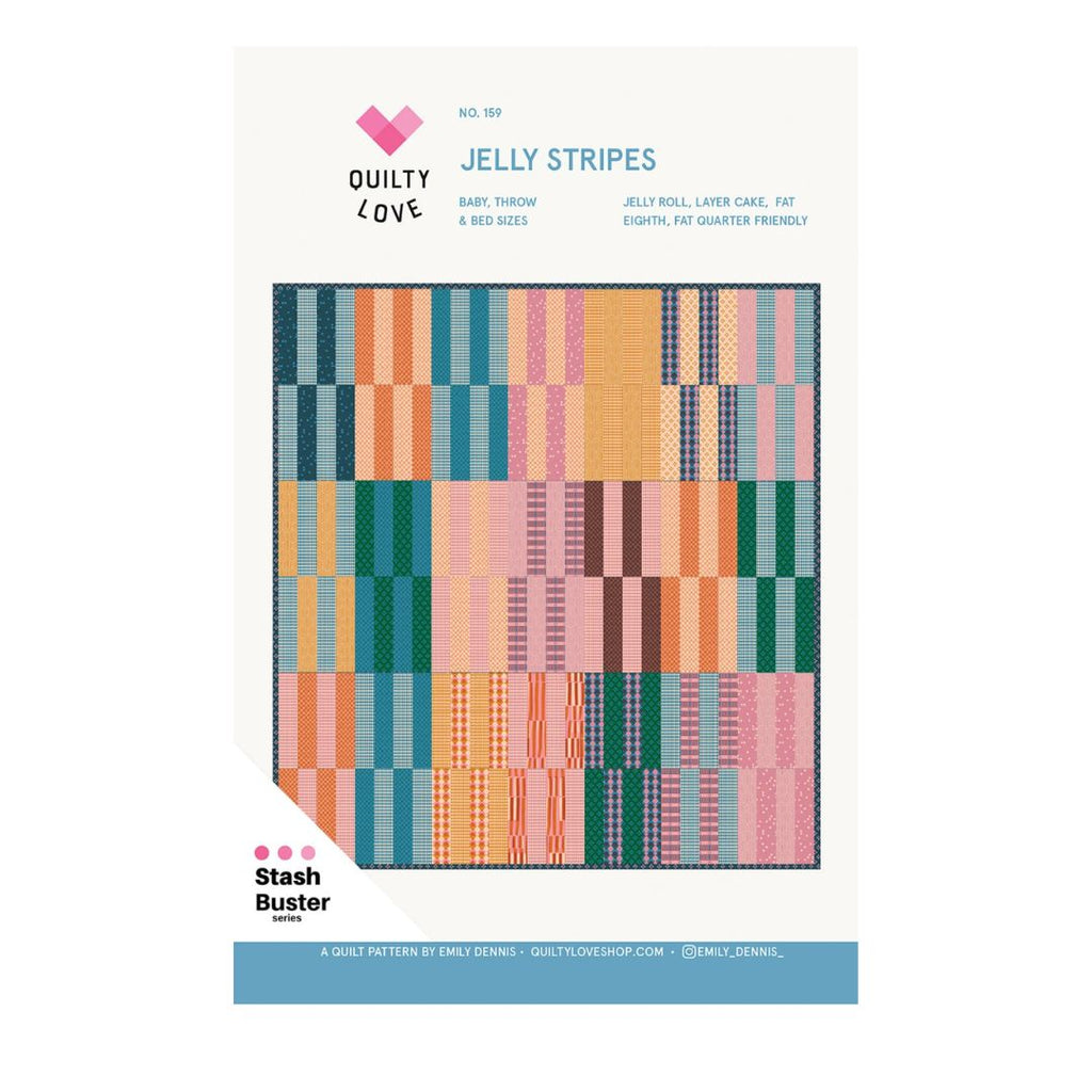 The Jelly Stripes Quilt Pattern is a fun and modern stash-busting quilt pattern that makes the most of your favorite fabrics! Designed by Emily of Quilty Love, this easy strip-pieced quilt is perfect for beginners and seasoned quilters alike. Use fat quarters, layer cake squares, jelly roll strips, or fat eighths from your stash to create this fast and satisfying quilt. The simple construction and bold stripe design come together beautifully making it perfect for a weekend quilting project or even a relaxing afternoon sew. Go for a coordinated color-block layout or embrace the charm of a scrappy quilt look, either way, you’ll love how quickly this quilt top comes together. With its beginner-friendly instructions and versatile design, the Jelly Stripes Quilt is one you’ll want to make again and again!