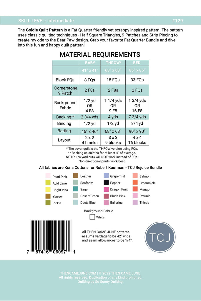 The Goldie Quilt Pattern by Meghan Buchanan of Then Came June. The Goldie Quilt Pattern is a Fat Quarter friendly yet scrappy inspired pattern. The pattern uses classic quilting techniques - Half Square Triangles, 9 Patches and Strip Piecing to create my ode to the Bear Paw design. Garb your favorite Fat Quarter Bundle and dive into this fun and happy quilt pattern!