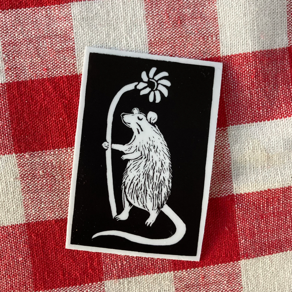 Vinyl 3" waterproof sticker! Originally a block print, now digitized onto a sticker. Features a cute rat holding a flower.
