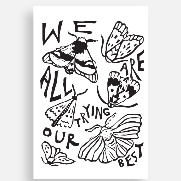 Black & white sticker featuring moths & the phrase "we are all trying our best." Originally a block print, now digitized onto a sticker.