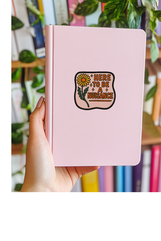 Bold, defiant, and a little bit cheeky—this patch-style sticker is for the lovable troublemaker. Featuring a retro daisy, playful sparkle accents, and bold type that looks stitched onto a wavy-edge background, this design is perfect for feminists, disruptors, and anyone proudly rocking their inner nuisance. Stick it on your laptop, water bottle, planner, or protest sign—it’s made to stir things up in the cutest way possible.