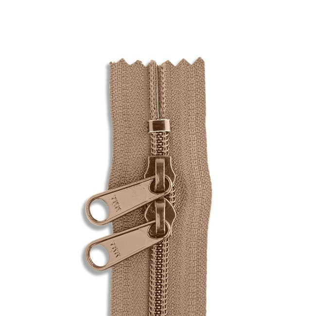 YKK #4.5 nylon coil non-separating, dual closed-end zipper. Zipper is close-ended on both sides. Features two extra-long sliders positioned head-to-head. Ideal for use with backpacks, luggage and bags. Available in a variety of colors and lengths. YKK is a registered trademark of YKK Corporation in Japan and other countries/regions.