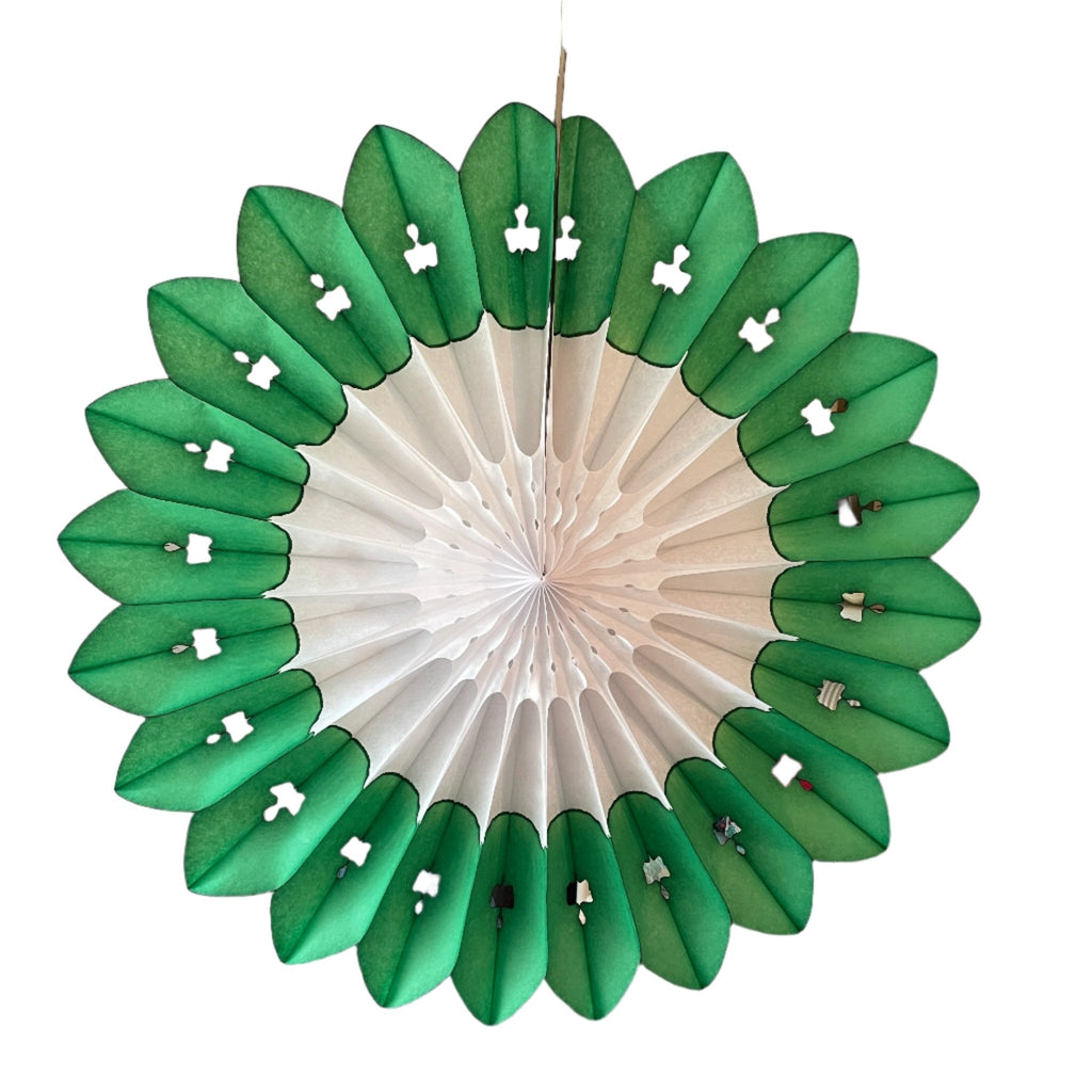 Decorate for St. Patrick's Day in style with these huge 27 inch Shamrock themed tissue paper party fan decorations! Crafted from the finest honeycomb tissue paper, these shamrock fans are hand-dyed bright green over white and come with an attached hanging string.