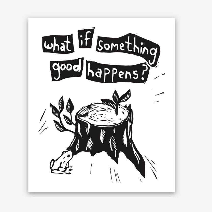 Vinyl 3" weather resistant sticker! Features a linocut image with a frog and a stump, reading "what if something good happens?"