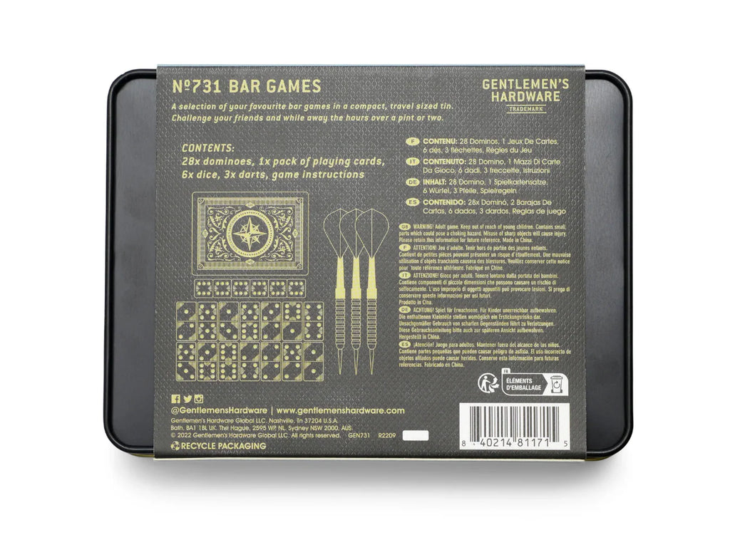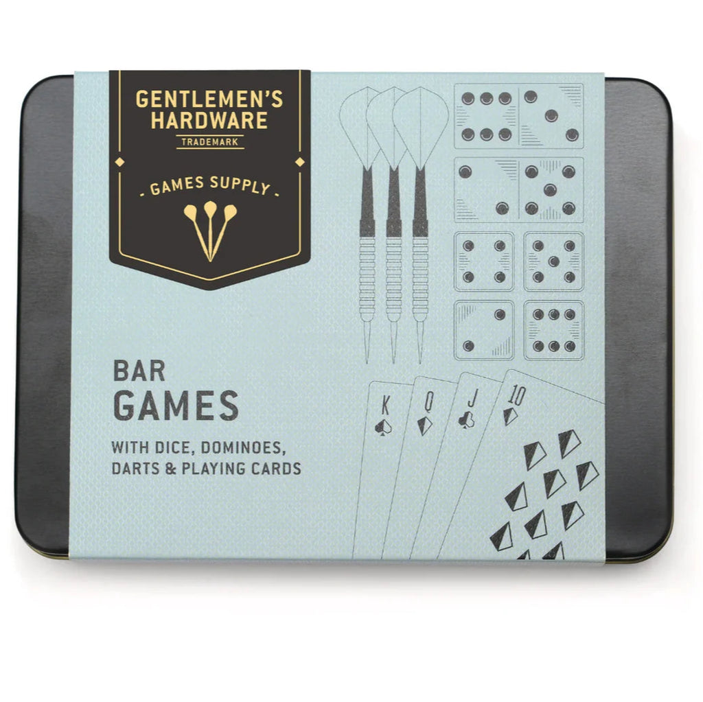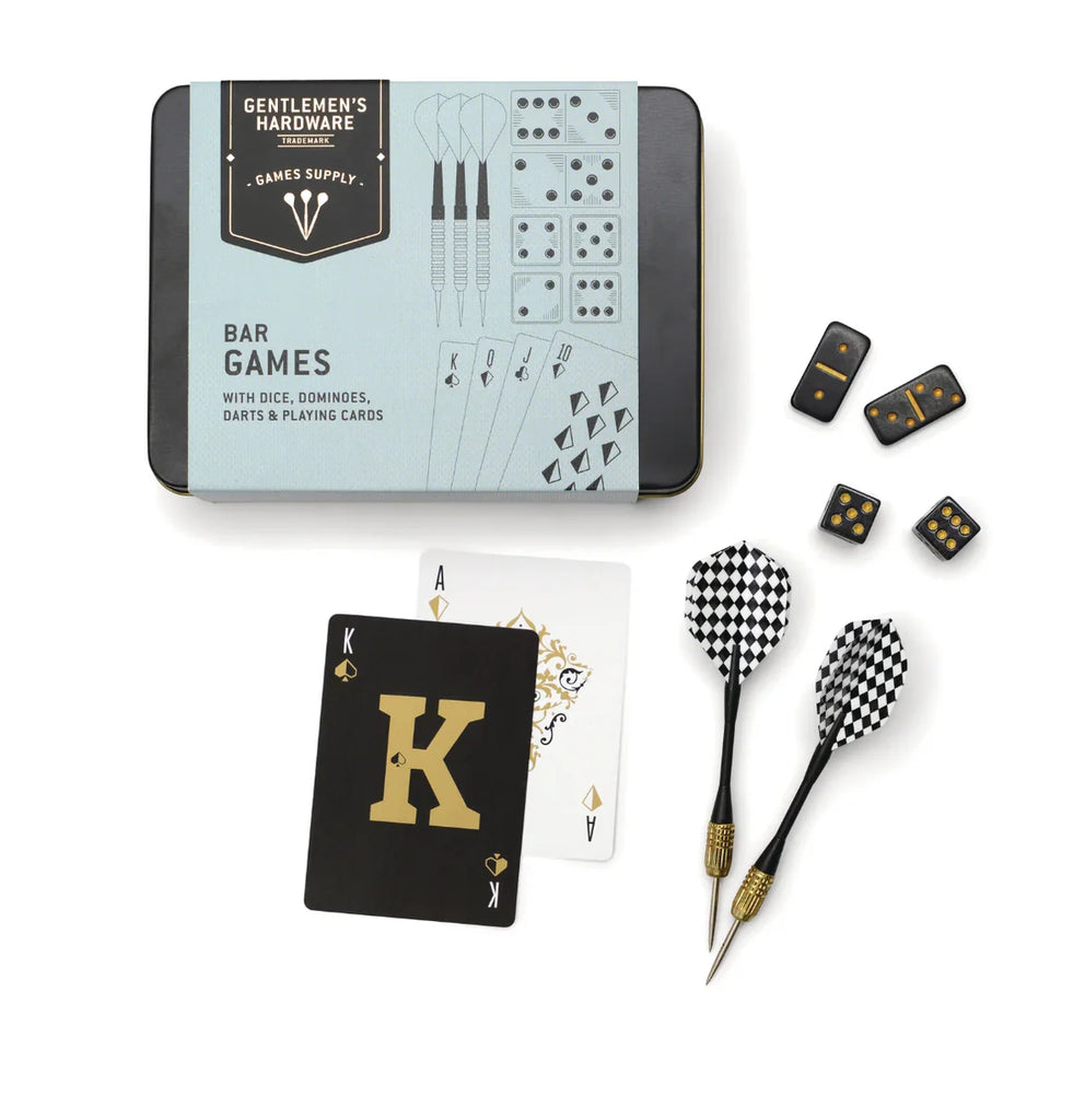 Raise the bar with this handy tin of bar games! Easy to pack and store, these bar games are perfect for on-the-go play. Each set includes vintage-inspired dice, dominoes, darts, and playing cards for maximum fun no matter where you are!