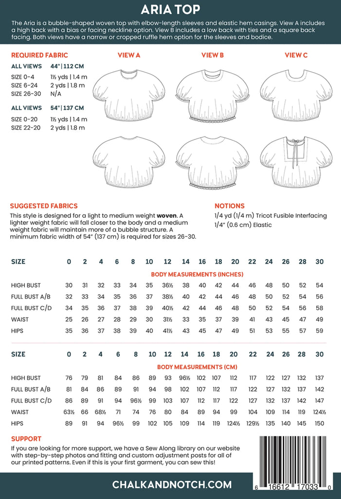 The Aria is a bubble-shaped woven top with elbow-length sleeves and elastic hem casings. View A includes a high back with a bias or facing neckline option. View B includes a low back with ties and a square back facing. Both views have a narrow or cropped ruffle hem option for the sleeves and bodice.