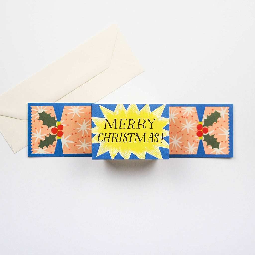 This Christmas cracker card pulls out like a real cracker and gives a cheery ‘MERRY CHRISTMAS!’ message inside. Featuring a bright painted and collaged star and holly design.