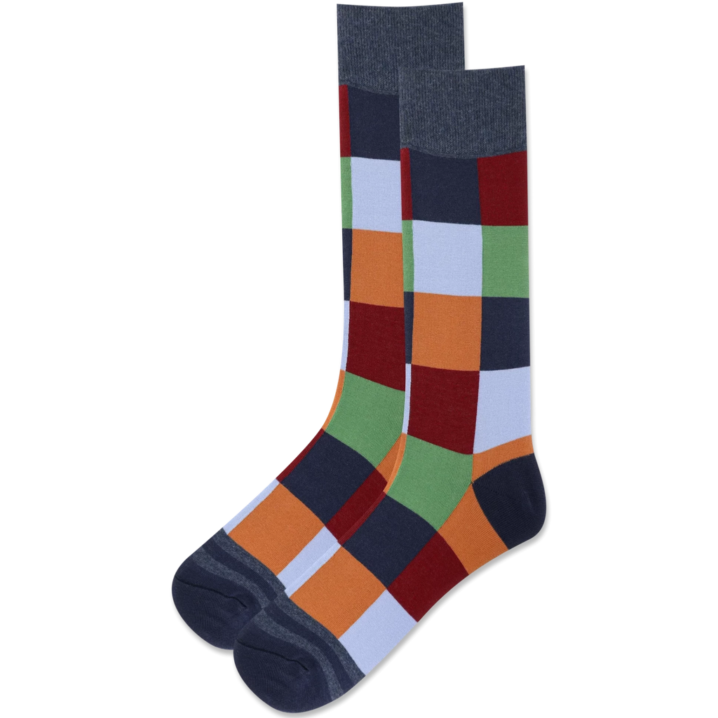 Reconnect with nature from the ground up. Step into this bold and vibrant pair of colorful box grid geometric socks with a grey cuff inspired by the Great Outdoors.