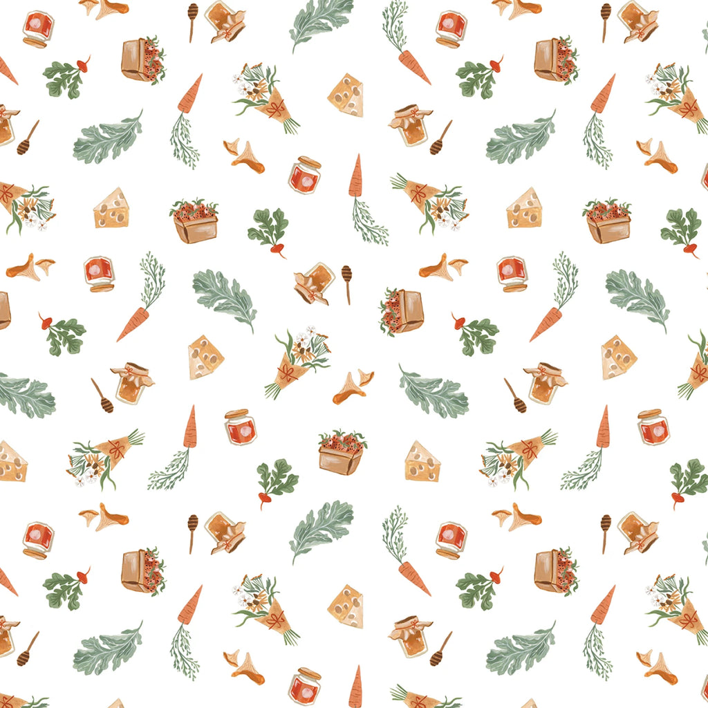 Description: This delightful fabric features a charming pattern of various farm-fresh produce and related items, including carrots, cheese, jars of preserves, and leafy greens, all set against a clean white background. The design is playful and whimsical, perfect for projects that evoke a sense of rustic charm and the joy of harvesting. Ideal for creating unique kitchen textiles, children's clothing, or home decor items, this fabric brings a touch of the countryside into any project.