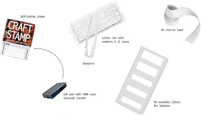 This DIY stamp offers easy and versatile customization, as it comes with its own set of letters, including numbers and 12 typical icons of the handmade textile world.