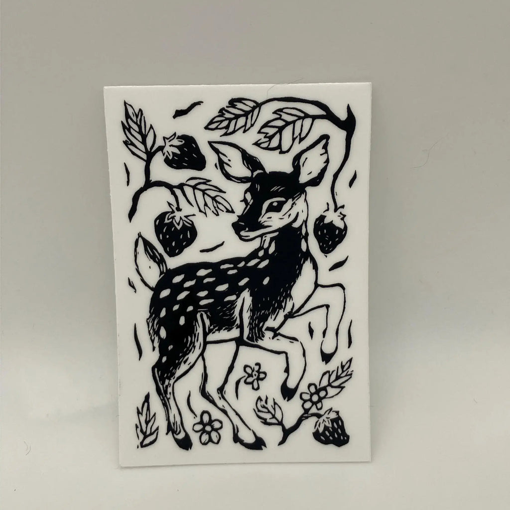 Black and white deer with strawberries sticker. Originally a block print, now digitized onto a sticker.