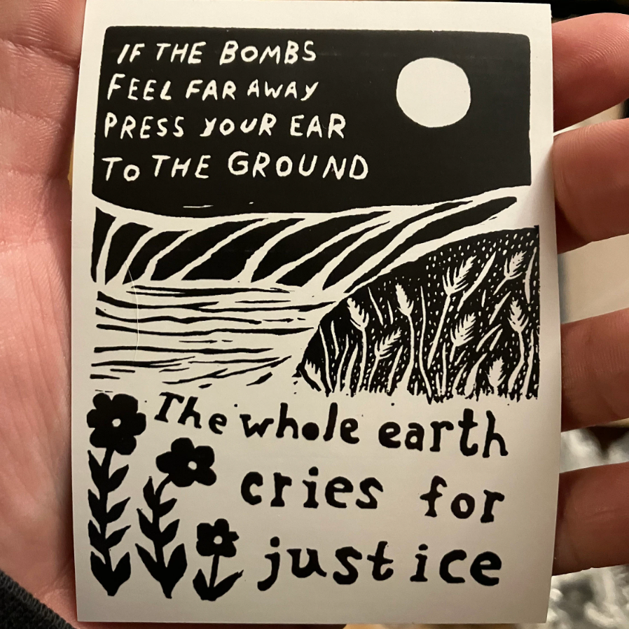 Reads, "if the bombs feel far away press your ear to the ground / the whole earth cries for justice" Vinyl 4" waterproof sticker! Originally a block print, now digitized onto a sticker. Ceasefire, peace, antiwar